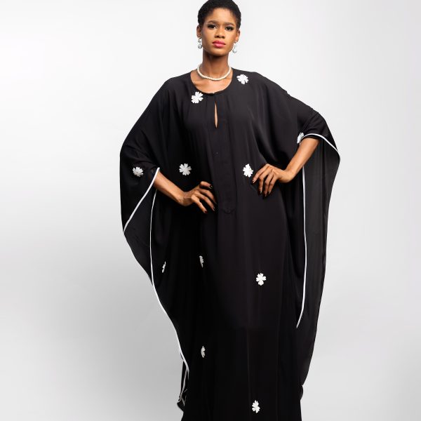 Black chiffon boubou with white lace flowers and bias at the edge, N250k