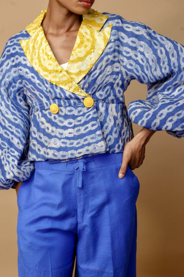 Blue adire silk cotton cropped jacket with collar revers in yellow and buttons N350k