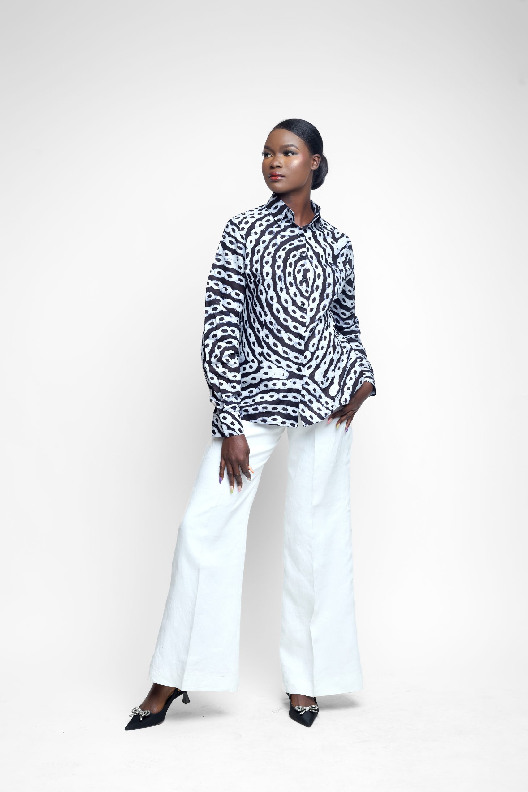 | Content | Linen/cotton shirt in Black and White Adire patterns | Double breasted green and purple adire linen / cotton cropped jacket with fushia pink braid trim and buttons N400k Fushia pink palazzo trouser N160k | Empire cut jacket dress with front sash | Traditional adire dress with front buttons , neck ruffles and sleeves in navy blue organdie N280k | linen/cotton shirt in Navy blue and Sky blue Adire pattern | Cotton T-shirt With Fashion Illustrations | ||||||||||||