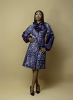 Traditional adire dress with front buttons , neck ruffles and sleeves in navy blue organdie N280k